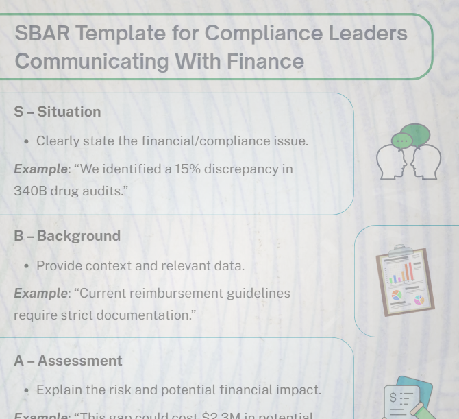 However, communicating complex compliance risks in a way that aligns with financial priorities requires a structured approach. This is where the SBAR tool (Situation, Background, Assessment, Recommendation) becomes invaluable for justifying financial decisions and resource allocation. (Download a helpful SBAR template at the end of this article)